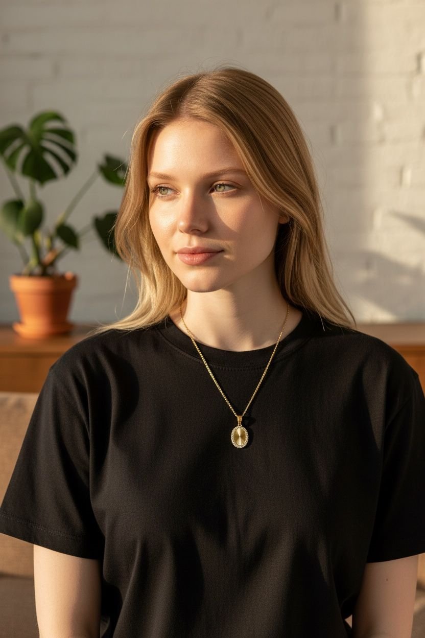 This gold oval pendant necklace blends classic elegance with modern detail. Designed with a delicate gold-tone chain and an oval pendant featuring a sunburst-textured center surrounded by shimmering crystals, it adds a refined statement to any outfit. Crafted from durable stainless steel with an anti-tarnish finish, this necklace is perfect for both everyday wear and special occasions.