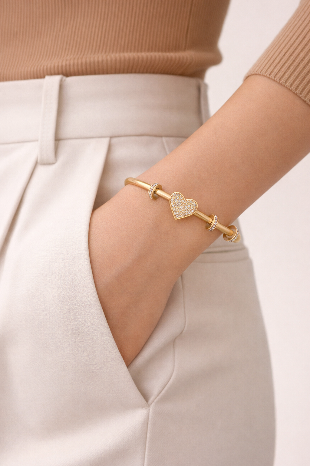 A sleek gold-tone bangle featuring a crystal-encrusted heart centerpiece and pavé-accented rings — a timeless symbol of love and elegance.