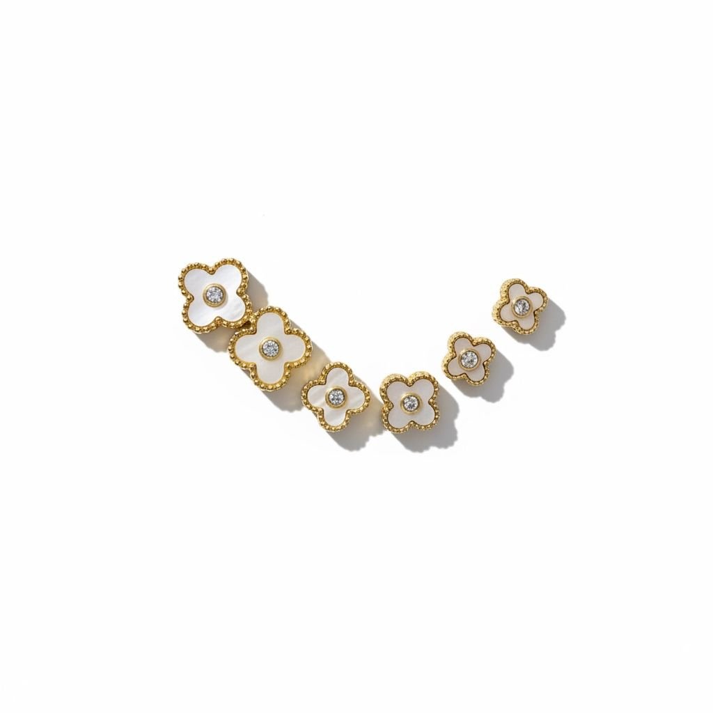Elegant white clover drop earrings in three graduated sizes, crafted in anti-tarnish stainless steel with a polished gold finish.
